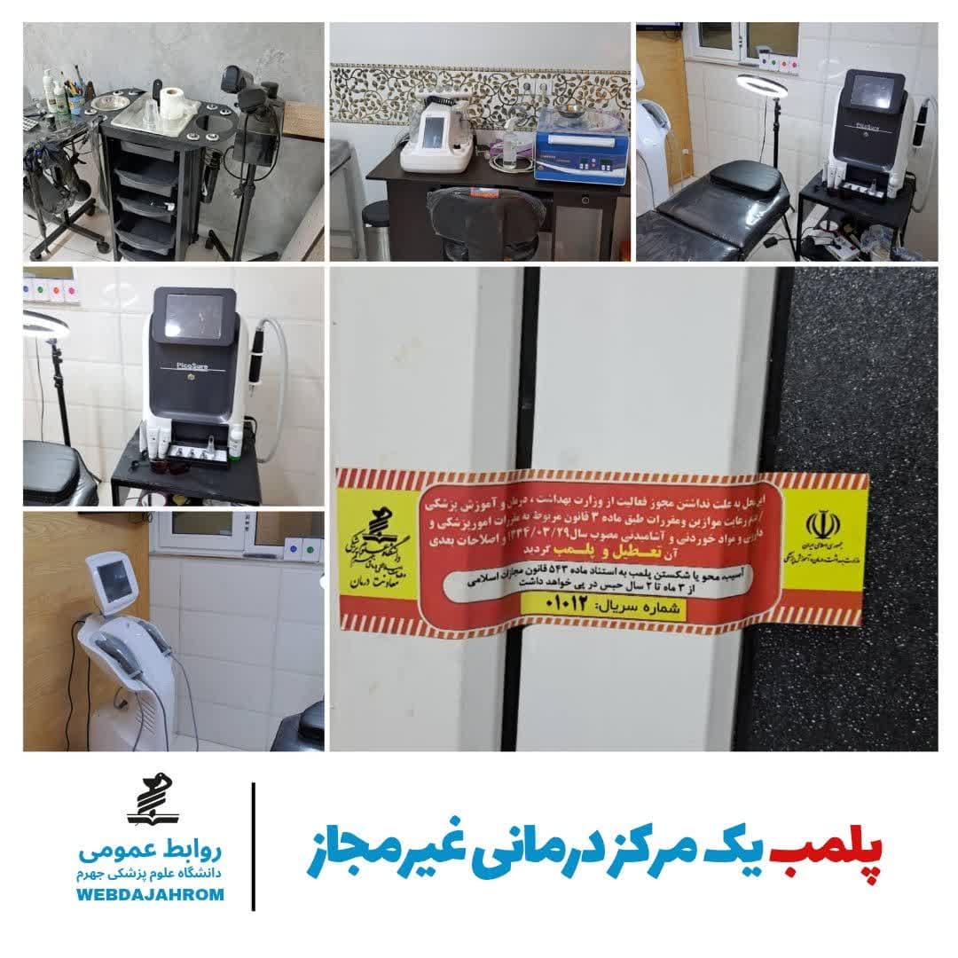 در پی تشدید بازرسی‌های نظارتی و با تلاش کارشناسان اداره نظارت بر درمان دانشگاه علوم پزشکی جهرم، کمیسیون ماده ۱۱ تعزیرات حکومتی امور بهداشتی و درمانی دانشگاه و با حضور نماینده اداره نظارت بر اماکن نیروی انتظامی، یک مرکز غیرمجاز ارائه دهنده خدمات درمانی در جهرم پلمب و پرونده متخلف برای طی مراحل قانونی به مراجع قضایی ارجاع شد.
