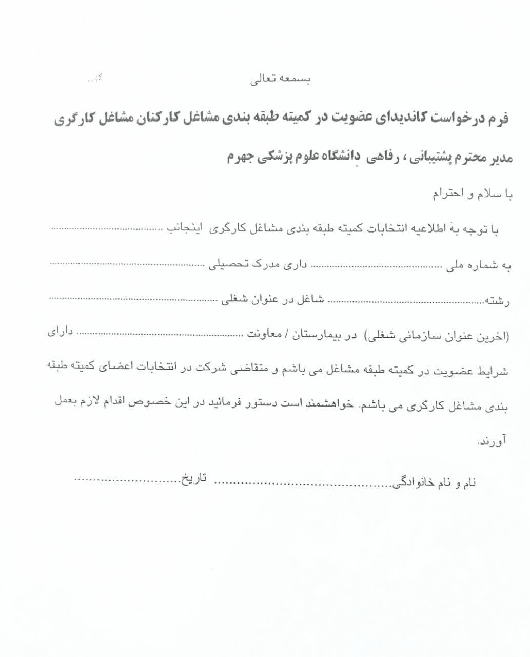 با توجه به اینکه مقرر گردیده به استناد ردیف‌های ۷ و ۸ بخشنامه 17/1404/100 مورخ 404/5/17 وزارت متبوع، ماده 49 قانون کار و نامه شماره ٣٥۲۱۵8 مورخ 404/5/27 اداره کل تعاون، کار و رفاه اجتماعی استان فارس نسبت به  برگزاری انتخابات به منظور تعیین اعضای کمیته طبقه بندی مشاغل کارکنان مشاغل کارگری (تبصره 4 ماده4)  دانشگاه اقدام گردد، شایسته است همکاران محترم در صورت تمایل به اعلام نامزدی انتخابات مذکور یا داشتن شرایط ثبت نام،  تا تاریخ 10شهریور ماه نسبت به تکمیل فرم مربوطه اقدام نمایند.