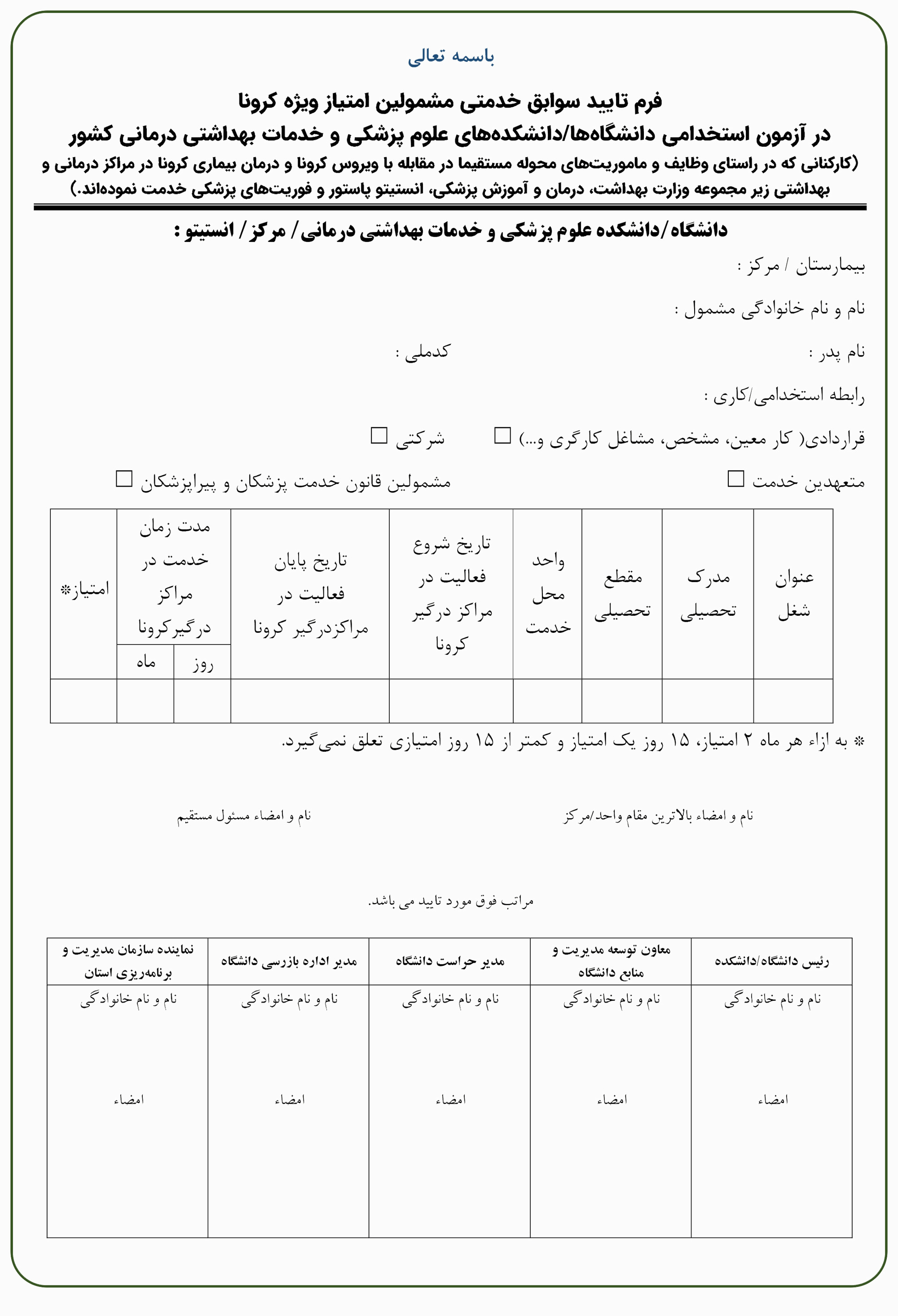 فرم امتیاز دهی سوابق کرونا در ذیل قابل مشاهده و دریافت می باشد.