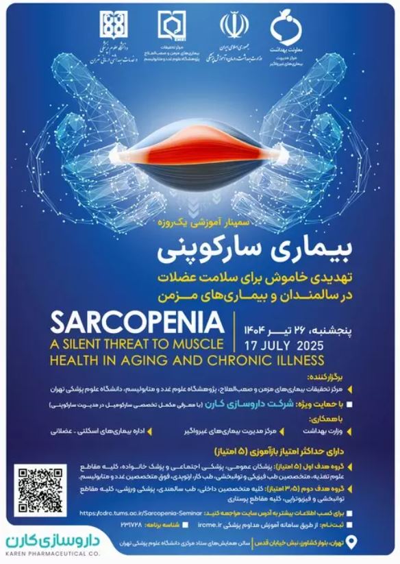 نخستین سمینار علمی–آموزشی بیماری سارکوپنی با تمرکز بر تشخیص، پیشگیری و مداخلات تغذیه‌ای و درمانی، روز پنج‌شنبه ۲۶ تیر ۱۴۰۴ از ساعت ۸ تا ۱۳ در سالن همایش‌های ستاد مرکزی دانشگاه علوم پزشکی تهران برگزار خواهد شد.